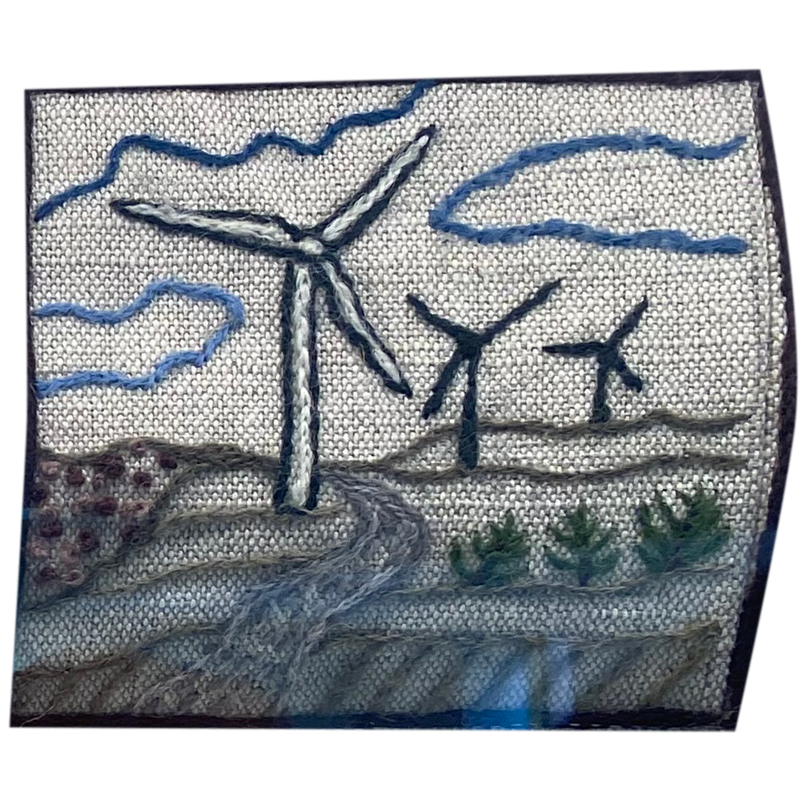 Both the artist and stitcher have a particular interest in wind turbines – the former has one in her garden, the latter’s son is a renewable energy expert and, at the time of stitching, Chair of Scottish Renewables.